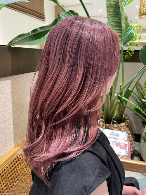 柔らかなウェーブにほんのりピンクのニュアンスが溶け込んだラベンダーカラー。自然光で艶やかに輝く髪色が、透明感と品のある華やかさを引き立てます。落ち着いた色味ながらも遊び心を感じさせるスタイルで、個性をさりげなくアピールしたい方におすすめです。